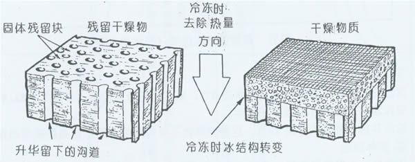 溶液結(jié)晶的形式對凍干速率有直接的影響。冰晶升華后留下的空隙是后續(xù)冰晶升華時水蒸氣的逸出通道,大而連續(xù)的六方晶體升華后形成的空隙通道大,水蒸汽逸出的阻力小,因而制品干燥速度快,反之樹枝形和不連續(xù)的球狀冰晶通道小或不連續(xù),水蒸汽靠擴散或滲透才能逸出,因而干燥速度慢。因此僅從干燥速率來考慮,慢凍為好。